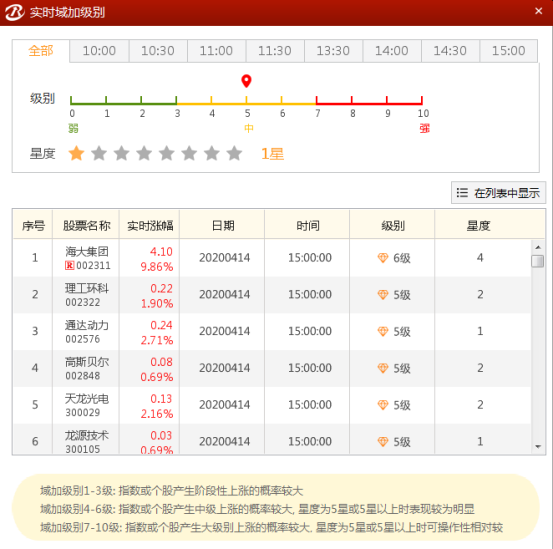 是域加级别系统的主动弹出功能,即系统每30分钟,会将符合系统触发条件的个股通过表格的形式展示给用户。