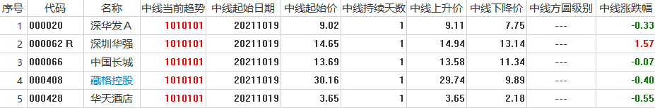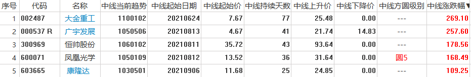 容维中线上升趋势股票列表:将所有处于容维创富中线系统买入信号提示的个股显示出来,将趋势代码为所有1开头的个股显示出来,如1010102、1040101等等。[注:系统默认的个股范围为A股/B股/指数/容维行业/容维概念。]