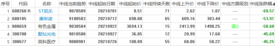 容维中线下降趋势股票列表:将所有处于容维创富中线系统卖出信号提示的个股显示出来,将趋势代码为所有9开头的个股显示出来,如9040901、9010905等等。[注:系统默认的个股范围为A股/B股/指数/容维行业/容维概念。]