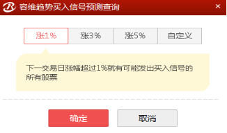 容维中线买入信号预览列表:是指数或个股内在趋势由弱转强的功能列表,预测其第二天的上涨幅度会有以下4种情况,即1%,3%,5%,自定义涨幅。